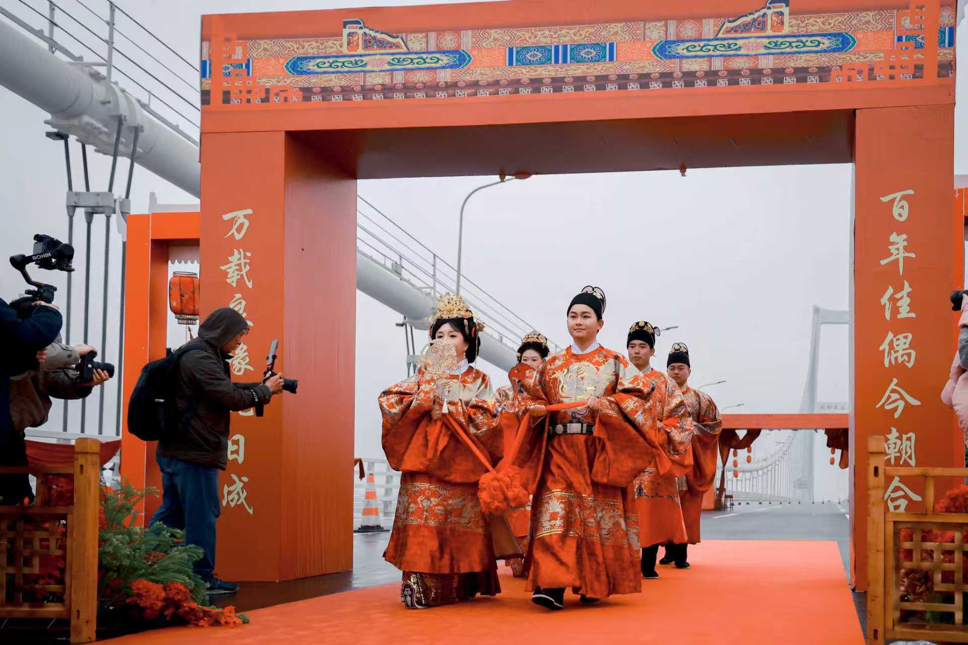 3月18日,一场别开生面的中式集体婚礼在湖北交投投资建设、中交二航局承建的武汉双柳长江大桥上浪漫上演。三对来自建设一线的新人,在巍巍桥塔与滔滔江水的见证下,身着中式传统婚服,行古礼、结同心,以“桥”为媒,许下相守一生的誓言。